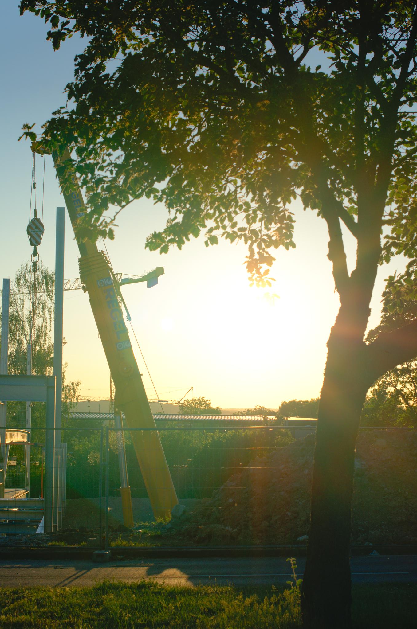 Fast romantischer Parkhausrohbau im Sonnenuntergang.